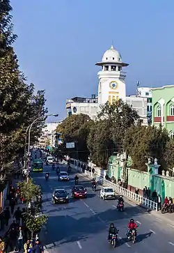 The Ghanta Ghar (घन्टाघर), situated in the capital city of Kathmandu, is the oldest clock tower of Nepal. It lies in front of Rani Pokhari and near Trichandra College. It was built by Rana Prime Minister Bir Shumsher. The original clock tower was designed after Big Ben of London, as Western influence crept into Nepalese architecture during the Rana era. The GhantaGhar that stands today was rebuilt after the 1990 BS earthquake, standing on the site of the original after the old tower was destroyed by the earthquake.