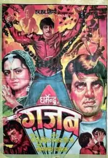 Ghazab (transl.Amazing) is a 1982 Indian Hindi-language action comedy-drama film starring Dharmendra and Rekha. The film was a remake of the Tamil film Kalyanaraman.[2] The movie was a 'Hit' and the performance of Dharmendra was critically acclaimed.