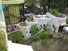 Studio Ghibli director Hayao Miyazaki designed the museum himself, using storyboards similar to the ones he creates for his films. The design was influenced by European architecture such as the hilltop village of Calcata in Italy. The museum features internal and external spiral staircases built from iron, interior bridges, and balconies stretching throughout the building's height. These stairways lead to exhibits, dead ends, and across bridges.[2] These characteristics are meant to reflect Miyazaki's building designs displayed in his film work.[3] Miyazaki's aim was to make the building itself part of the exhibit,[4] and for the museum to be an uplifting and relaxing experience "that makes you feel more enriched when you leave than when you entered".