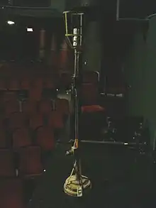A ghost light is an electric light that is left energised on the stage of a theatre when the theatre is unoccupied and would otherwise be completely dark. It typically consists of an exposed incandescent bulb, CFL lamp, or LED lamp mounted in a wire cage on a portable light stand.[1] It is usually placed near centre stage. Ghost lights are also sometimes known as equity lights or equity lamps, possibly indicating their use was originally mandated by the Actors' Equity Association, or Equity.[2][3]