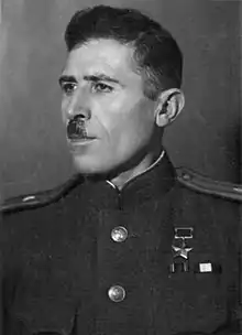 Madoyan fought in World War II starting in June 1941 after the German invasion of the Soviet Union. He became a company commander and fought in the Battle of Stalingrad in late 1942. In December, he took command of the 3rd Battalion of the 159th Separate Rifle Brigade. In early February 1943, the brigade, attached to the 28th Army, fought in the North Caucasian Strategic Offensive, whose objective was to recapture the North Caucasus from retreating German troops. On the night of 8 February, his battalion captured Rostov's railway station, one of the first units to advance into the city. In the morning, then-Senior Lieutenant Madoyan took command of consolidated units from the brigade, and defended the station for six days until reinforcements arrived on 14 February. According to Soviet reports, the troops repulsed 32 German counterattacks,[2] killed up to 300 soldiers, and destroyed a tank and three firing positions. On 31 March, Madoyan was awarded the title Hero of the Soviet Union and the Order of Lenin for "exemplary leadership, courage, and heroism".[1][3] On 6 January 1944, he was awarded the United States Army Distinguished Service Medal for his actions at Rostov.[4]