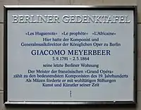 On 9 September 2013 a plaque to mark Meyerbeer's last residence was put up at Pariser Platz 6a, Berlin.[143]