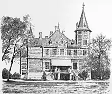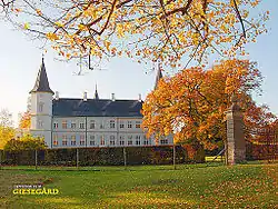 Giesegaard is a manor house and estate located in Ringsted Municipality in Denmark. The estate is owned by Michael Brockenhuus-Schack and has been owned by members of the Schack/Brockenhuus-Schack family since 1736. The oldest part of the main building was built in 1751 for countess Anna Sophie Schack but it was later expanded by an extra storey in 1847 and adapted in 1873 and again in 1904. It now appears as a two-storey, white-plastered building with two octagonal towers and black-glazed tile roofs. The estate covers 3,115 hectares of land.