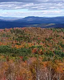 Gile Mountain in Windsor County, Vermont, sits along the border between the towns of Norwich and Sharon; its summit is in Norwich. The mountain reaches a height of 1,873 ft (571 m) above sea level. Relatively unimposing considering its height, the true summit cannot easily be seen from the surrounding territory, despite the prominent fire tower atop its summit. The tower is easily reached by taking Turnpike Road from Norwich to the parking area near its terminus. From there, the Gile Mountain trail leads west 0.7 miles (1.1 km) to the summit, passing under power lines. The summit area contains an old ranger cabin, since converted to a shelter-type structure (though camping is not allowed), and the tower itself. From the top views are expansive, and on a clear day one can see Mount Ascutney to the south, the Green Mountains from Killington Peak to Mount Mansfield to the west, Mount Cardigan, Smarts Mountain, and Croydon Peak to the east, and Mount Cube and Mount Moosilauke to the northeast with many of the White Mountains beyond. Dartmouth College is also visible, about 7 miles (11 km) distant.