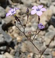 The tops of the stem branches bear spreading inflorescences of glandular purple to pinkish-lavender flowers. Each flower has a short tubular throat which is yellow and blue inside and five slightly protruding stamens with bluish anthers. The fruit is a small, rounded capsule. It is an annual herb and flowers bloom March to August.[1]
