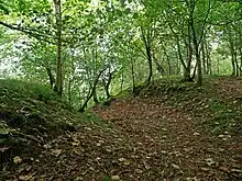 In 1984 a trial trench was opened at Gillies Hill fort across the defences in the south sector.[4] Three stone faced ramparts were explored - material for the construction of the rampart had been obtained by surface quarrying of the surrounding area. Within the fort was a layer of occupation debris containing pottery, including the upper half of a decorated vessel with more cultural material recovered from within the ramparts. This material, along with radiometric dates, suggests activity from the Late Neolithic/Early Bronze Age and the Iron Age – the presumption being that the ramparts derive from the later, Iron Age activity. The nature of the earlier Late Neolithic/Early Bronze Age activity on the hill remains uncertain.