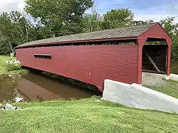 The Gilpin's Falls Covered Bridge is a Burr arch through truss wooden covered bridge in Bay View, Cecil County, Maryland, United States, close to the town of North East. The bridge was constructed by local Cecil County bridgewright Joseph George Johnson in the autumn and winter of 1860-61 across North East Creek. The bridge was erected adjacent to and upstream of Samuel Gilpin's mills and dam and crosses the millpond formed by it. This bridge has a span of 100 feet (30 m) and a total length of 119 feet (36 m) with its shelter panel overhangs, is 13.5 feet (4.1 m) wide, and is closed to all vehicular traffic.[2][3]
