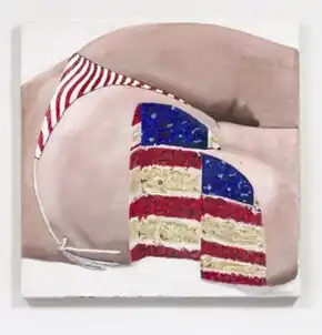Gina Beavers, American Flag Sponge Butt Cake, acrylic on linen on panel, 48" x 48" x 4", 2020.