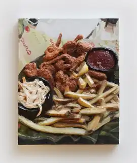 In her exhibition of the same year, "Palate" (the title a homophone for "palette"), she turned to small, low-relief works based on online food photography.[36][31] The depictions ranging from marbled meat, oysters and shellfish to less exalted offerings (e.g., Food Porn! (Chicken & Waffles) and Applebees!, 2012) and employed unorthodox materials (pumice stone, glass beads) to better capture the textures of foods like pie crust or dipping sauce.[21][2] New York Times critic Roberta Smith wrote that Beavers "exaggerated and satirized both the act of painting and the fetishization of food by professional photographers and hungry diners … captur[ing] certain extremes of indulgence that verge on gross."[31] She and others connected the paintings (e.g., Red Velvet Cake) back to the messy sensuality of earlier work, such as Carolee Schneemann's Meat Joy (1964), Claes Oldenburg's anthropomorphic Store (1961), Red Grooms's painted sculptures and Photorealism.[31][21]