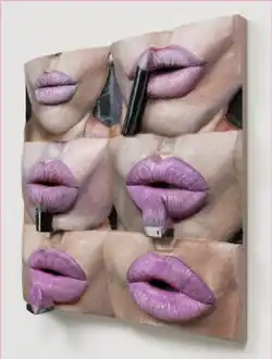 In subsequent shows, such as "World War Me" (2020), Beavers examined identity and the ubiquitous presence of the female face and body in art and advertising through the lens of a fractured social-media self-consciousness craving recognition and popularity.[15][4][37] Her boldly painted reliefs depicted enlarged, often repeating features (lips, hands, fake nails), faces and torsos in bikini underwear flaunting art-historical (Van Gogh, Picasso, Mondrian and others) and consumer culture motifs.[18] Roberta Smith wrote, "These works conflate all kinds of self-improvement and adornment projects: makeup, tattoos, cosmetic surgery and nail art as well as fandom and celebrity-worship. Their blaring billboard power from afar is countered by a squirm-worthy intimacy up close."[4][15]