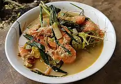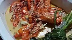 Ginataang hipon is one of the simpler types of ginataan. The basic recipe includes unshelled shrimp with the heads intact, coconut milk, onion, garlic, ginger/turmeric, patis (fish sauce) or bagoong alamang (shrimp paste), and salt and pepper to taste. It can also be spiced with siling haba or labuyo peppers.[1][2][3] The onion and garlic are first sautéed in oil in a pan, followed by the shrimp, then the rest of the ingredients are added until cooked. Some recipes prefer to boil the coconut milk until it is reduced and oily, while others keep the dish soupy. Coconut cream is also preferred if available, instead of thin coconut milk. The dish does not normally include any type of vegetables. Some versions, however, add leafy vegetables, bamboo shoots (labong), tomatoes, and/or cucumber.[4][5][6][7][8]