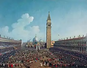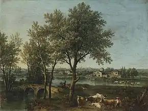 Important early patrons of Cimaroli were Marshal Schulenberg, Count Tessin of Sweden, and the British merchant and diplomat settled in Venice, Joseph (Consul) Smith.[8] It was through the disposition of Consul Smith's art collection, hand-picked by Smith for King George III,[9] that six landscapes by Cimaroli entered the Royal Collection, of which three oval views survive.[10] Cimaroli, despite the esteem of contemporaries, was nearly forgotten until the mid-twentieth century,[9] but has undergone a revival of critical interest, typified by the publication of the first catalogue raisonné of his paintings.[3]