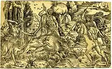 Atalanta and Meleager hunting the Calydonian boar, woodcut, Palumba's largest (270 × 445 mm) and perhaps most accomplished print.[7]