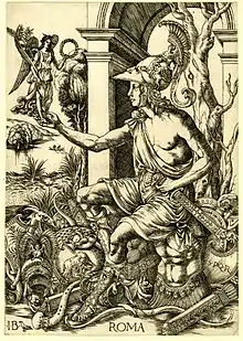 In the drawing the background is a Dürer-esque clump of trees and rocks, but in the print this is replaced by the famous Roman ruin known as the Temple of Minerva Medica, in fact a nymphaeum, given an invented coastal setting.[42] In the print "the classically inspired female nude and accompanying putti [the children] arrange themselves into the sort of tightly knit pyramidal configuration universally associated with principles of Italian High Renaissance design".[43]