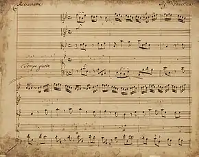 His earliest works for the cello are two Sinfonie included in a manuscript in the abbey of Montecassino.[6] His other works include a number of operas, masses, and a funeral anthem for the Duke of Marlborough. One of his operas, Xerse, parodied material in an earlier setting of that opera by Francesco Cavalli, including the aria "Ombra mai fu". Bononcini's Xerse was in turn adapted by Handel in his Serse with a third (and best known) version of "Ombra mai fu". Bononcini's song "Vado ben spesso cangiando loco" was used by Franz Liszt in his suite for piano Années de pèlerinage: Deuxième année: Italie under the erroneous title "Canzonetta del Salvator Rosa".