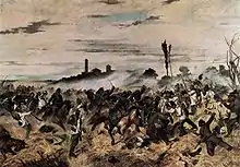 His old age was marked by a bitter disillusionment with the social and political order that had emerged in postunification Italy.[4] He continued teaching at the Accademia, but preferred clinging to tradition instead of adopting new ideas. Known for his honesty and candor,[5] Fattori deplored the direction he saw some of his students were taking in the 1890s, as a group of them, led by his favourite pupil Plinio Nomellini, adopted a Neo-impressionist style, the Divisionismo (Chromoluminarism).[6] In 1891 he engaged in a polemic against pointillism.