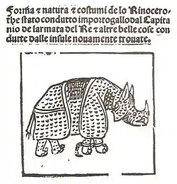 The frontispiece of his work states "Forma & Natura & Costumi de lo Rinocerothe stato condutto importogallo dal Capitanio de larmata del Re & altre belle cose condutte dalle insule nouamente trouate"" (English: The Shape, the Nature and the Way of the Rhinoceros brought by the Captain of the Portuguese King's Armada and other beautiful things brought from the new insulars). This work was published on July 13, 1515 (about 10 cm × 9,5 cm) and depicts the oldest representation of the rhinoceros since Roman times, of a specimen known by its Gujarati name of Ganda, presented to King Manuel I of Portugal, by Afonso de Albuquerque in May 1515.[1][2] It is thought to have influenced Dürer's Rhinoceros.[3]