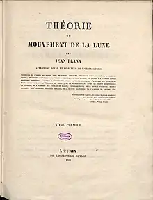 Plana's contributions included work on the motions of the Moon, as well as integrals, (including the Abel–Plana formula), elliptic functions, heat, electrostatics, and geodesy. In 1820 he was one of the winners of a prize awarded by the Académie des Sciences in Paris based on the construction of lunar tables using the law of gravity. In 1832 he published the Théorie du mouvement de la lune, the same year he was elected a Foreign Honorary Member of the American Academy of Arts and Sciences.[2] In 1834 he was awarded with the Copley Medal by the Royal Society for his studies on lunar motion. Charles Babbage visited Turin in 1840 at the invitation of Giovanni Plana. Plana became astronomer royal, and then in 1844 a Baron. At the age of 80 he was granted membership in the prestigious Académie des Sciences. He died in Turin.
