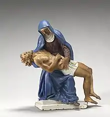One of his finest works is a large retable at Volterra in the church of San Girolamo, dated 1501; it represents the Last Judgment, and is remarkable for the fine modelling of the figures, especially that of the archangel Michael, and a nude kneeling figure of a youth who has just risen from his tomb.[1] Another work that equalled that anything of his father's, from whom the design of the figures was probably taken, is the washings fountain in the sacristy of the Basilica of Santa Maria Novella at Florence, made in 1497.[2] It is a large arched recess with a view of the seashore painted on maiolica tiles at the back. There are also two painted maiolica panels of fruit trees let into the lower part. In the tympanum of the arch is a white relief of the Madonna between two adoring angels. Long coloured garlands of fruit and flowers are held by nude boys reclining on the top of the arch and others standing on the cornice. All this part is of enamelled clay, but the basin of the fountain is of white marble.[1]