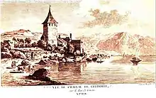 In 1150 [1] or around 1160,[2] the Bishop of Lausanne built a keep on the site of the former Glerula, to guard a narrow part of the road between Lausanne and Vevey. The first documentary mention of the castle is in about 1270 [1] or in 1271,[2] when Bishop Jean de Cossonay gave it as a feoffment to Hugo de Palézieux. Around 1300 [1] or in 1303,[2] the diocese reclaimed its rights. The fortifications of Glérolles were improved. The castle served a civil as well as a military purpose. It is recorded that several gangs of brigands were captured near Glérolles and were executed there. On the first floor, there was a device called la cage aux sorcières ('the witches' cage'), a sort of large chest made of thick planks reinforced inside and outside with iron, and having a grille which allowed anyone confined within it only the minimum of air and light. In the late 15th and early 16th centuries, Bishops Aymon de Montfalcon and Sébastien de Montfalcon made further improvements to the fortifications. The castle acquired the nickname of "the Chillon of Lavaux".[1] In 1531, the castle lent 10 cannons to the town of Vevey, to fire salutes upon the arrival and departure of the visiting Charles III, Duke of Savoy.[2]