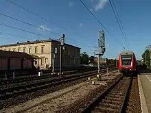 The station building, which dates from the building of the line, is to the west of the road to Havelberg and south of the tracks, on the side facing away from the town. It was probably designed by the planning director of the Berlin–Hamburg Railway, Friedrich Neuhaus together with Ferdinand Wilhelm Holz.[6] The basic design of the building is similar to Ludwigslust station and the original Boizenburg station building, which no longer exists.[7] The two-story building with a flat hip roof has an L-shaped ground plan. The outer side facing north on the side of the tracks has six portals and the side facing east towards the federal highway has nine portals. This asymmetric plan differs significantly from most other station buildings on the Berlin–Hamburg railway.[4] The shape of the building, unlike some other stations of the Berlin–Hamburg railway, has not been altered by later additions with the exception of a loggia[6] attached to the inside of the courtyard after 1859. Living quarters were established in the longer wing of the building and the waiting rooms among other things were located in the shorter wing.[4]