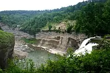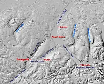 The current upper Genesee (above Mount Morris) was only the west branch in preglacial times, a tributary river to the original. This branch, which entered the old valley was also dammed in the Nunda area by moraines. A lake was formed with varve clay sediments visible along the valley sides in many spots, but the lake drained as the river found a way to cut a new valley northeastward from Portageville a little west of the original valley, then drop back into the old valley at Mount Morris. This section of new valley is a spectacular gorge with three scenic waterfalls, that is now the site of Letchworth State Park.