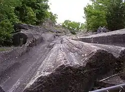 An outstanding example of glacial grooves can be found at the Glacial Grooves at Kelleys Island, Ohio (a National Natural Landmark), the most impressive of which is 120 metres (400 ft) long, 10 metres (35 ft) wide, and up to 3 metres (10 ft) deep. These grooves cut into the Columbus Limestone. Striations cover the sides and bottoms of the grooves.