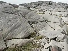 Glacial striations or striae are scratches or gouges cut into bedrock by glacial abrasion. These scratches and gouges were first recognized as the result of a moving glacier in the late 18th century when Swiss alpinists first associated them with moving glaciers. They also noted that if they were visible today that the glaciers must also be receding.[1]