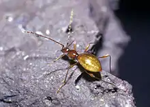 Glacicavicola bathyscioides is a shiny, translucent, brownish-orange, ant-like beetle, approximately 6 mm long by 2mm wide. It has become well-adapted to the troglobitic lifestyle: it has long thin antennae covered in fine setae, and slender legs (also covered in setae) which allow it to easily traverse the difficult terrain present in its environment.[2] The beetle is completely blind, lacking eyes and optic neuropiles.[3] Its abdomen exhibits false physogastry, which means that it appears larger than it truly is, due to the enlarged dome-like elytra which covers the entire abdomen.
