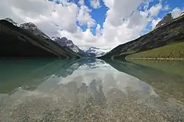 Glacier Lake was named by Sir James Hector of the Palliser expedition in 1858 for the fact the lake is fed from glaciers, specifically the glaciers of the Lyell and Mons Icefields[2] as well as the Forbes North Glacier. The lake is surrounded by Mount Outram, Division Mountain, Mount Erasmus and Survey Peak. The lake is fed and discharged by the Glacier River, which is a tributary of the Howse River. The lake can be accessed via a 8.9 kilometres (5.5 miles) trail which starts near Saskatchewan River Crossing along the Icefields Parkway.[3] Park at the Glacier Lake trailhead (at the end of a short unnamed road 1.1 km (0.7 mi) west of the David Thompson Highway turn-off).