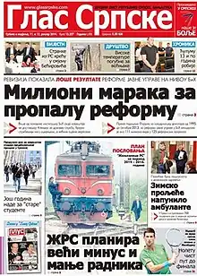 The Glas Srpske (lit. 'The Voice of Srpska'[1]) is a Bosnian daily newspaper published in Banja Luka. Together with Bosniak-oriented Dnevni avaz from Sarajevo and Croat-oriented Dnevni list from Mostar, Glas Srpske is one of three main ethnic newspapers in Bosnia and Herzegovina addressing various issues primarily from the mainstream or elite perspective among Bosnian Serbs.[1][2] Glas Srpske is together with Nezavisne novine one of the two newspapers in widest circulation in the entity of Republika Srpska.[3]