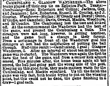 In the 1890-91 Scottish Cup first round, the club was drawn away to Cambuslang, and after equalizing an early Cambuslang goal, the Wanderers conceded two more before half time, and a dull second half saw the home team win 3–1.[13]