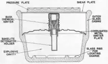 The mine consists of a glass bowl, six inches (15 cm) in diameter containing an explosive charge and a detonator. The top of the mine was covered by a sheet-glass disk 0.25 inches (6.4 mm) thick, under a thick, moulded glass pressure plate. Each mine was supplied with a small quantity of cement putty to seal gaps between the main body and the glass disk cover and make the mine waterproof.[2]