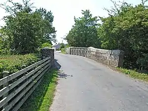 The old overbridge, built in 1819–23, in Glasson (NY254606) is a listed structure.[3] It was originally built as a bridge over canal. It has a cast-iron parapet. The Plinth with rounded corners was originally the supporting structure for the canal drawbridge, increased in height to convert it to a railway bridge. An old canal lock keepers cottage also survives.[10]
