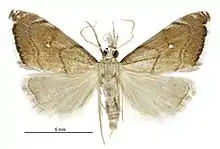 Glaucocharis bipunctella is a moth in the family Crambidae.[1] It was described by Francis Walker in 1866. This species is endemic to New Zealand and has been found in the Auckland region, in the southern parts of the North Island and in the Nelson region. It inhabits dense native forest. Larvae of this species have been raised on liverworts. Adults are on the wing in November to January and are attracted to light.