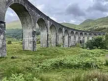The viaduct is built from mass concrete, and has 21 semicircular spans of 50 feet (15 m).[12] It is the longest concrete railway bridge in Scotland at 416 yards (380 m), and crosses the River Finnan at a height of 100 feet (30 m).[12][8][13] The West Highland Line it carries is single track, and the viaduct is 18 feet (5.5 m) wide between the parapets.[12] The viaduct is built on a curve of 792 feet (241 m).[14]