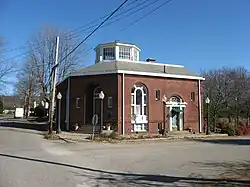 Built of brick on a brick foundation, the bank is covered by a slate roof and features various elements of stone;[8] a single-story rectangular building, its stretcher-bond walls are divided into two bays on some sides and three bays on the others. The main entrance is located in a recessed entryway at one of the corners; concrete steps provide access to the entrance, which features a rounded archway above to its panelled ceiling. A subsidiary entrance is located nearby on the southern side; it features a wooden cornice with Neoclassical ornamental urns, which together separate the transom from the fanlight. The building's exceptional Neoclassical styling is reinforced by the interior, which includes carefully worked oak wood.[2]