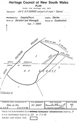 In 1982 the house and part of its estate (bounded by the Main Southern Railway on the west) was made subject of a Permanent Conservation Order under the NSW Heritage Act 1977. Meanwhile, the larger estate was designated a Scenic Protection zone in 1975 and part of it set aside for development of a botanic garden in 1984.[1]