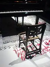 The piano had to be set at a certain height and would be raised on wooden blocks if necessary.[45] A rug would sometimes be required for his feet.[46] He had to sit exactly 14 inches (360 mm) above the floor, and would play concerts only with the chair his father had made. He used this chair even when the seat was completely worn.[47] His chair is so closely identified with him that it is shown in a place of honour in a glass case at Library and Archives Canada.