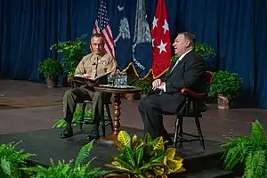 Walters moderates a discussion with U.S. Secretary of State Michael R. Pompeo during a visit at The Citadel in Charleston, S.C. on November 11, 2019.