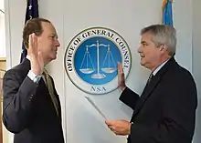 Glenn S. Gerstell (left) being sworn in as the NSA General Counsel at a ceremony at Fort Meade headquarters.
