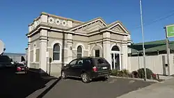 The 1891 section has an ornate parapet broken by a central gable and small gable roof entry lobby. This gable has an open-bed pediment above the central front opening. The openings on either side of the entrance have rectangular windows surmounted by an arched concrete moulding descending to a dripstone and broken by a keystone. The pair of windows either side of the entrance and side windows are casement windows and are delineated by concrete moulding that is horizontal beneath the sill and outlines the arch of the window shape. All windows are recessed into the wall.[1]