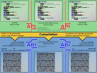 The Linux kernel and GNU C Library together form the Linux API. After compilation, the binaries offer an ABI.
