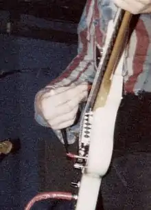 Glide guitar is a technique for playing guitar in which the player holds down the vibrato bar, and releases it again while strumming , resulting in a wavering pitch. It was developed with and is usually associated with a Fender Jazzmaster or Jaguar-style vibrato system. [1] It was developed by Irish musician Kevin Shields of My Bloody Valentine on the band's releases You Made Me Realise (1988)[1] and Isn't Anything (1988).[2] Shields often combined this technique with a reverse reverb effect from a Yamaha SPX90 unit or Alesis Midiverb II, and would also tune two neighboring strings of his guitar to nearly the same pitch.[3]