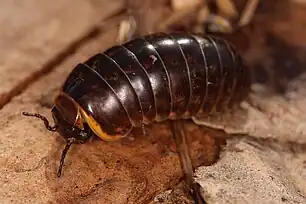 Glomeris klugii exhibits a wide range of colour variation. Many colour morphs and subspecies exist, each displaying unique colour patterns.[2] The base colour of the species typically ranges from light brown to red,[2] with many possessing vividly coloured chitin and a distinct marbled pattern.[3] However, the presence of black freckles on their bodies varies, with some individuals having freckles that fuse into larger spots, while others are fully black in colour.[2] G. klugii can reach a length of about 13.5 mm (0.53 inches) and a width of up to 6.25 mm (0.24 inches).[3] Telopods exhibit syncoxite with slight variations in the central lobe shape and delicately bifurcated coxal horns.[3] G. klugii also lacks a main stria on the thoracic shield.[2]