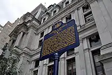 A state historical marker commemorating Gloria Casarez was installed at Philadelphia's City Hall on October 8, 2021. During the ceremony, the rainbow flag was raised in honor of National LGBTQ History Month in October, a tradition started by Casarez in 2010. The ceremony also took place during Breast Cancer Awareness Month and National Hispanic Heritage Month. The historical marker was approved in 2020 by the Pennsylvania Historical and Museum Commission but its installation was delayed due to the COVID-19 pandemic. Taking its place among several other LGBTQ-related state markers already in Philadelphia,[82] the historical marker for Casarez made national news since it was the first historical marker in the state of Pennsylvania honoring a person of Latin or Hispanic descent.[83][84]