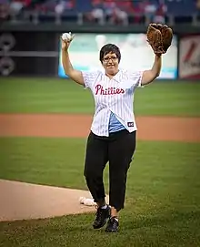 Gloria Casarez 'first pitch' at the Philadelphia Phillies game, Citizen's Bank Park on August 23, 2010. Photo: Mitchell Leff and the City of Philadelphia
