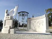 The memorial was constructed adjacent to the graves of three Hungarian soldiers who died in 1944. A twin memorial, the work of János Víg[3] is at its center. Placed on the circular stone there are the maps of the four continents shifted with respect to each other, with the affected areas marked with lead castings explaining the extent of the devastation visually. The section of the memorial alluding to ’56 can be construed as a victorious flag-carrier warship, indicating the fact that the Hungarian revolution was the first to succeed in forcing a break in the concrete wall of world-communism.[4] In October 2008 a summary in three languages of the Resolution 1481 (2006) of the Council of Europe entitled The Necessity of International Condemnation of the Crimes Committed by Totalitarian Communist Regimes was carved on the back of the “world wall”. The two initiators of the aforementioned resolution, Göran Lindblad of Sweden and Latshezar Toshev of Bulgaria were the orators at the ceremony of the handing over of this text. In the years since, the memorial has been enriched by the Holodomor memorial stone donated by the Ukrainian minority in Hungary,[5] by the tablet commemorating the Molotov–Ribbentrop pact, as well as the marble tablets honoring the memory of those slaughtered at Katyn and the Romani people (gypsy) and Jewish victims of communism. The memorial was created and is maintained by the Gloria Victis Foundation.