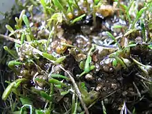 Glossostigma cleistanthum, also known as mudmat, is a freshwater aquatic plant native to Australia, New Zealand, India and East Africa.[1] It is a cleistogamous plant, which is a type of self-pollinating plant that can propagate using non-opening flowers. Where growth is submerged, the leaves are between 0.5–2.5 inches long and bear closed, self-pollinating flowers. These leaves are nearly sessile and grow along the stem in alternating pairs that resemble rabbit ears. Where water recedes and growth is emergent, the leaves are much smaller, ranging between 0.2–0.5 inches in length. The emergent plants produce insect-pollinated flowers located on short stalks.[1] It belongs to the family Phrymaceae which includes annuals and perennials.