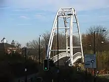 The primary impediments are a) a bowstring bridge over Honeybourne Way (located at 51°54′09″N 2°05′11″W / 51.90245°N 2.086434°W), built in 2002 to allow continued access by bicycle along the old trackbed alignment to Cheltenham Leisure Centre when planning permission was given for the redevelopment of the former Cheltenham Spa St. James station site as a Waitrose supermarket;[13] the resulting bowstring bridge follows a section of former railway embankment, which was removed to provide road access to the new store;[14] and b) the reduced-height pedestrian specification bridge carrying the footpath/railbed beneath the very busy St Georges Road, which would have to be replaced to allow trains to pass beneath the road. There is land space beside the bowstring bridge to allow a railway to be built beside it, but there is no way of avoiding the work necessary to get rail vehicles beneath St Georges Road.